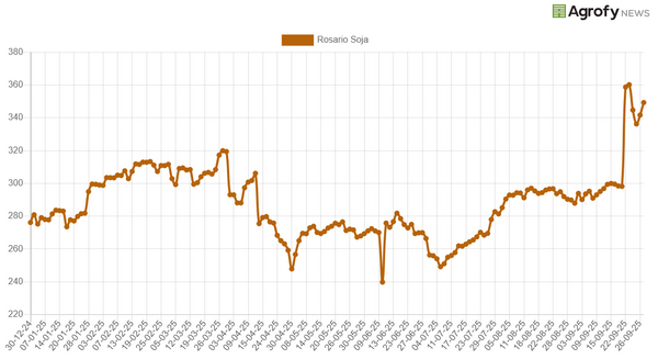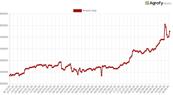 A continuación, la evolución del precio de la soja en Rosario, en pesos y en dólares: