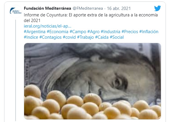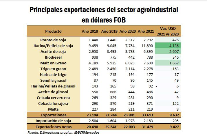 Del mismo modo, un documento elaborado por el investigador Juan Manuel Garzón, del Ieral de la Fundación Mediterránea, calcula que las exportaciones de granos y de sus primeros derivados industriales podrían estar llegando a 34.400 millones de dólares este año, 8.100 millones de dólares más que en 2020 y el máximo valor del que se tenga registro.