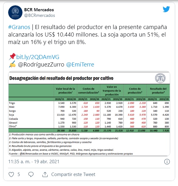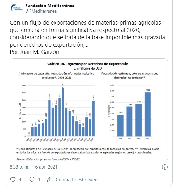 “Considerando que se trata de la base imponible más gravada por derechos de exportación, la recaudación asociada a estos productos también crecería mucho, podría llegar a 7.800 millones de dólares, lo que representa un incremento de 2.000 millones respecto al aporte hecho en 2020”, remarca Garzón.