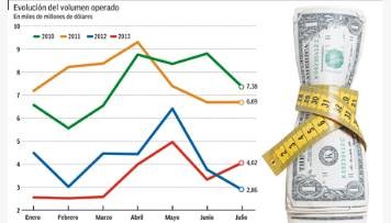 En julio, el volumen operado en el mercado cambiario creció 40% interanual y superó lo transado en el mismo mes del año anterior por primera vez en 2013. Tras la caída estrepitosa de los meses de enero y marzo (43% y 42% interanual, respectivamente) la llegada de la cosecha 2012-2013 alivió un poco la situación.