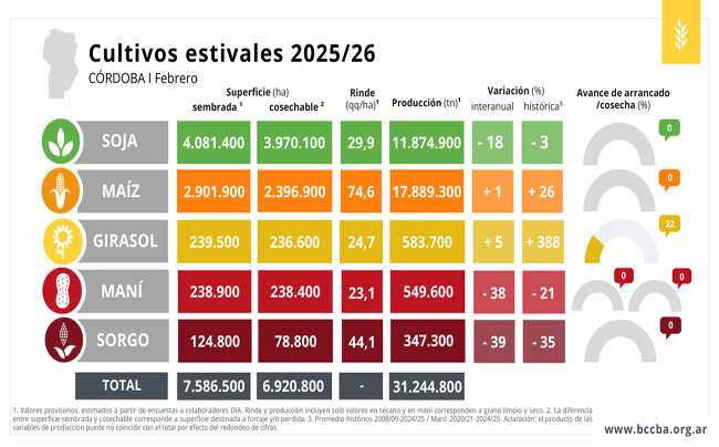 De esta manera, la Bolsa de Cereales de Córdoba (BCCBA) efectuó la primera estimación de producción de cultivos estivales en el marco de una campaña 25/26 fuertemente influenciada por el clima.