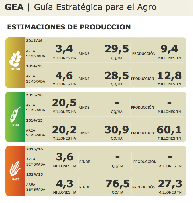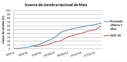 En su resumen sobre el estado de los cultivos, y el progreso de siembra y cosecha de cada uno, el GEA estimó que "con 60% del área de intención sembrada con maíz 2015/16, prevalece la incertidumbre respecto de la superficie final ante el impacto que pueden tener las siembras tardías. De confirmarse la superficie estimada, la reducción respecto del ciclo precedente sería del 16%".