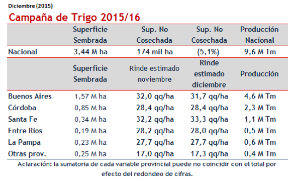 Hubo trabajos de teledetección realizados con Landsat 8 en el corazón triguero, que permiten verificar las estimaciones previas en la importante cuenca de Tres Arroyos. Con una adición de 80 mil ha en la provincia de Entre Ríos que pasa ahora a totalizar 190 mil hectáreas, siguiendo el trabajo del SIBER de la Bolsa de Cereales de Entre Ríos, se actualiza la estimación de superficie nacional de trigo 2015/16 en 3,44 millones de ha. Aumentó la cifra estimada de superficie que no ingresaría a cosecha, a 175.000 ha, debido a los severos daños que dejó la tormenta de granizo del día 18 de noviembre.