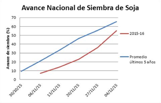 Y si hablamos de soja, la BCR informó que "con problemas por las lluvias de noviembre y diciembre, se han sembrado casi 11,3 M de ha con soja, lo que representa el 55% del total intencionado. Pese a los problemas de excesos, las últimas lluvias alcanzaron las zonas más mediterráneas y fueron oportunas para el avance de la siembra de soja. Con 20,5 M de ha de soja en el ciclo 2015/16, se puede proyectar la producción en 55 M de toneladas".