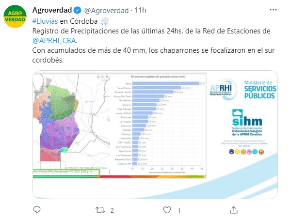 Tal como lo habia anticipado AGROVERDAD en el pronóstico publicado en esta web, volvieron las lluvias a Córdoba.