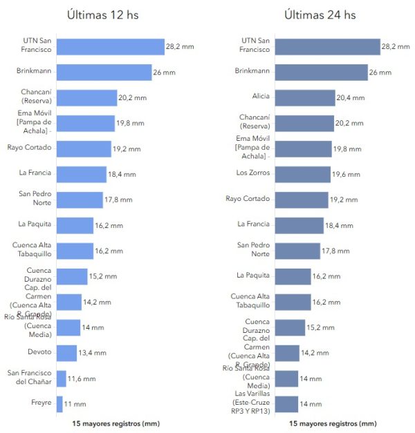 El podio lo ocupa la localidad de San Francisco, cabecera del departamento San Justo, donde se registraron 28,2 mm; le siguen Brinkamnn, con 26 mm; Alicia, con 20,4 mm; Chancaní (en el departamento Pocho), con 20,2 mm; Los Zorros (Tercero Arriba), con 19,6 mm; Rayo Cortado (en Río Seco), con 19,2 mm; La Francia, con 18,4; y San Pedro Norte (en Tulumba), con 17,8 mm.