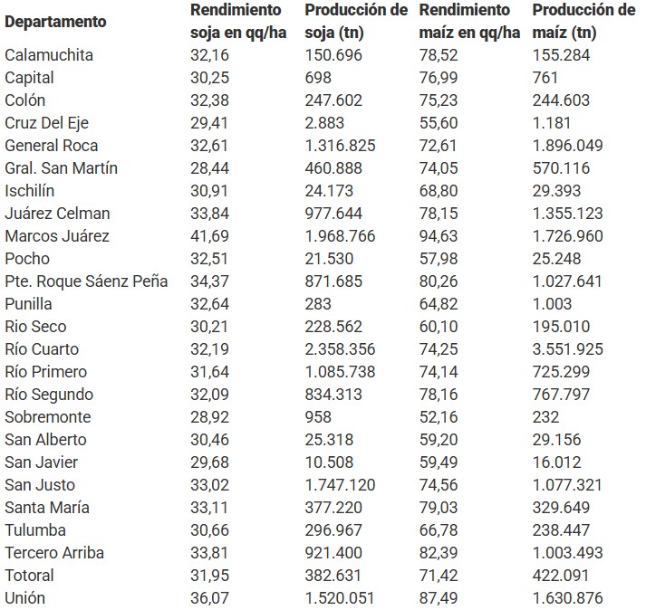 Según el relevamiento, los departamentos del sureste provincial, Marcos Juárez, Unión y Tercero Arriba, mostraron los rendimientos más altos, con más de 33 qq/ha en soja y más de 80 qq/ha en maíz.