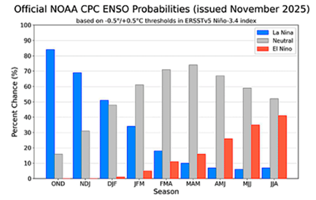 El pronóstico del IRI sitúa la probabilidad de La Niña en un 69% para el trimestre noviembre-diciembre-enero, disminuyendo al 51% si se evalua febrero de 26 (barras azules en el gráfico de abajo).