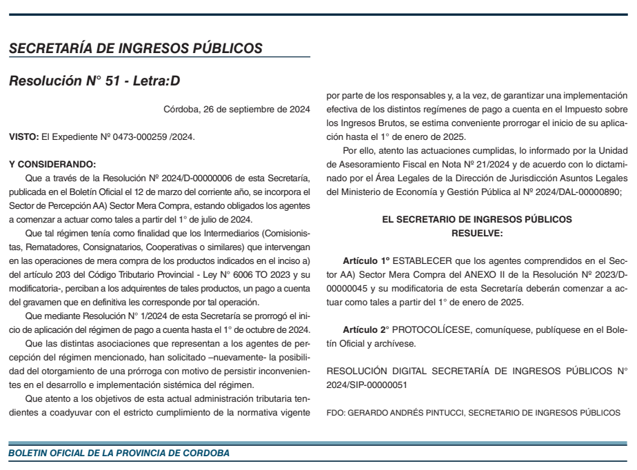 La Secretaría de Ingresos Públicos de la Provincia de Córdoba, prorroga el inicio de la aplicación del Régimen de Percepción por Mera Compra.