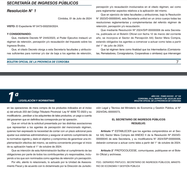 Mediante la Resolución N° 6/2024, publicada en el Boletín Oficial con fecha 12 de Marzo del corriente año, se incorpora el Sector de Percepción AA) Sector Mera Compra, estando obligados los agentes a comenzar a actuar como tales a partir del 1° de Julio de 2024. Ahora, a través de la presente Resolución, en virtud de la solicitud presentada por las distintas asociaciones que representan a los agentes de percepción del mencionado régimen, se prorroga el inicio de su aplicación hasta el día 1° de Octubre de 2024.