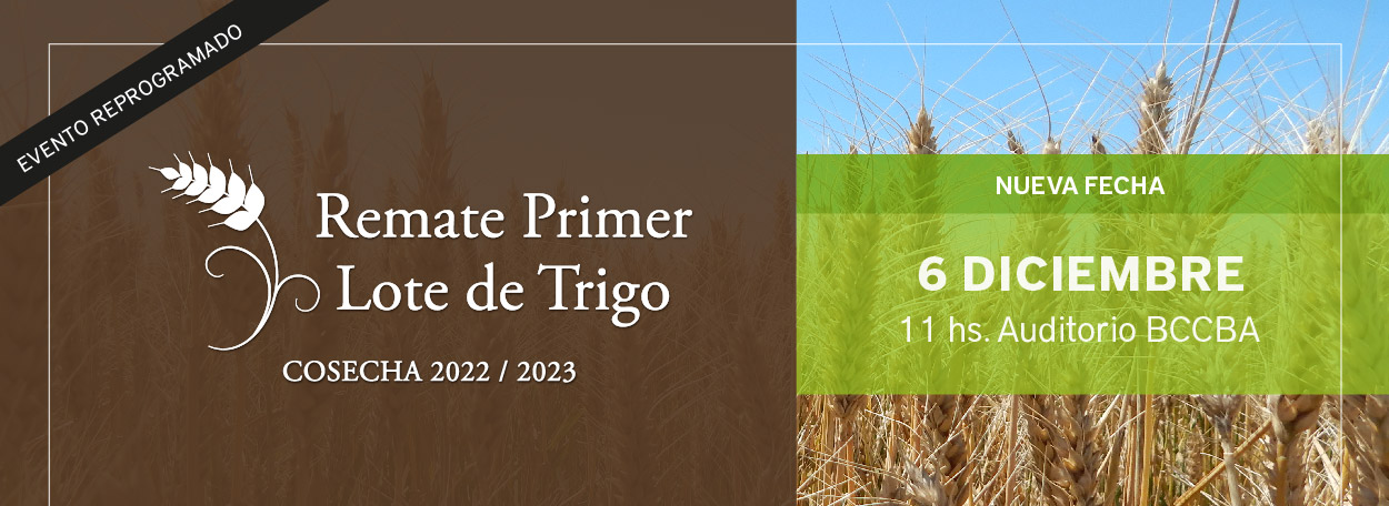 La Bolsa de Cereales de Buenos Aires y la Bolsa de Cereales de Córdoba le invitan muy especialmente a participar del Remate del Primer Lote de Trigo cosecha 2022/2023 que se realizará el martes 6 de diciembre, a las 11 hs. en la sede de la Bolsa de Cereales de Córdoba, Bv. Francisco Ortiz de Ocampo 317, Bº Gral. Paz, Córdoba.