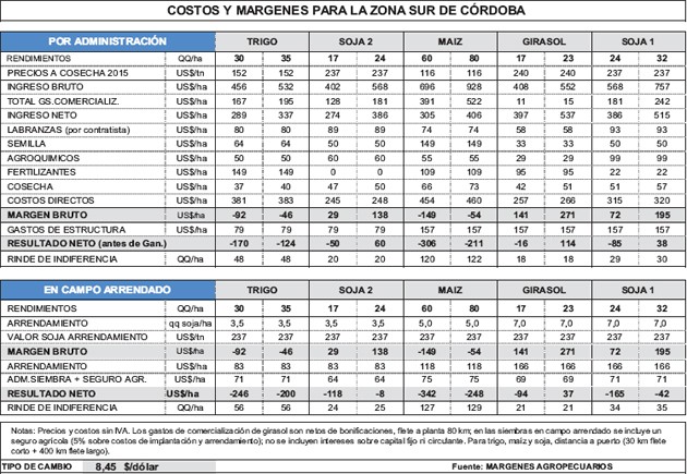 Síntesis: El agro con números derrumbados . Proyección de resultados sobre la base de los precios estimados a cosecha 2015, para trigo, girasol, maíz y soja,en campo propio y arrendado.
