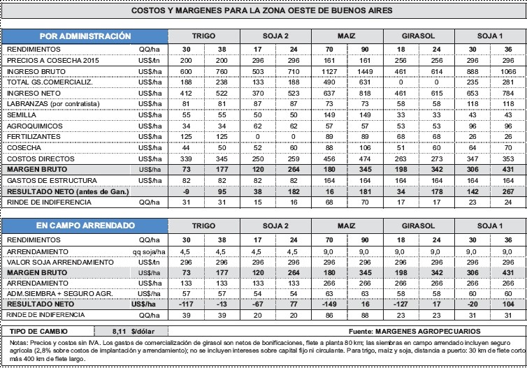 Proyección de resultados para la zona Sudeste de Buenos Aires sobre la base de los precios estimados a cosecha 2015 para girasol, maíz, soja y trigo.