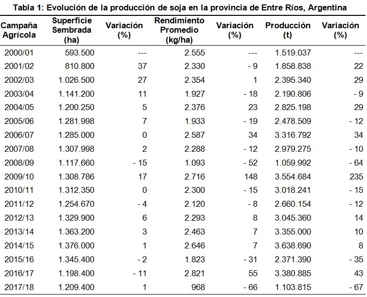 Según el relevamiento del SIBER “el área sembrada de soja en el ciclo 2017/18 tuvo un crecimiento interanual del 1 % (11.000 ha), pero el cultivo sufrió el impacto de una sequía que comenzó a manifestarse a mediados de noviembre del 2017 y se instaló definitivamente durante el trimestre enero – marzo del 2018. Este escenario generó una drástica caída en el rendimiento potencial del cultivo”.
