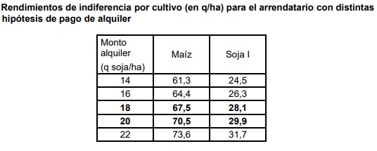 De esta forma en el caso de maíz se requiere, pagando un alquiler de soja de 18 quintales por hectárea de un rinde de indiferencia que es 27 % menor al promedio de productividad zonal mientras que en soja de primera se necesita un valor más alto, por lo menos una productividad 20 por ciento menor al promedio para pagar todos los costos incluyendo el alquiler”.