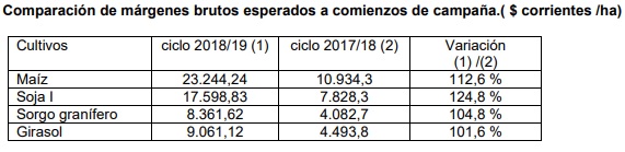 El informe muestra un comportamiento positivo en los resultados en pesos de todos los cultivos considerando iguales rendimientos promedio en los ciclos. Esto se debe a una leve mejora en los precios esperados en dólares: ocho por ciento en maíz y 17 por ciento en soja debido al esquema de baja de retenciones. A esto hay que agregar que entre junio de 2017 a junio pasado la depreciación del tipo de cambio fue 61,4 por ciento lo que mejoró en forma importante los márgenes.