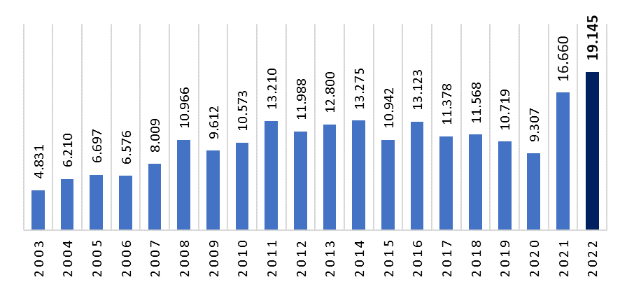 -Este papel se vio reforzado este año. La liquidación de divisas sólo por exportaciones de granos y subproductos este año alcanzó el récord histórico de 19.145 millones de USD, un 15% por encima del récord anterior en 2021, y un 109% por encima de 2020. El desafío estaría planteado por las salidas de dólares ante el aumento de importaciones y la formación de activos externos.