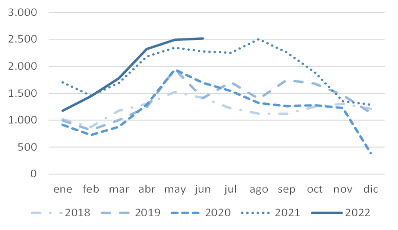 En el gráfico 2 puede observarse que la liquidación de divisas durante el primer semestre del año alcanzó el récord histórico de USD 19.145 millones, un aumento del 15% en relación a la cifra de 2021, que también había sido récord respecto a 2020 (con un aumento del 79%). La principal razón de este incremento ha sido el significativo aumento de los precios internacionales de los commodities agrícolas.