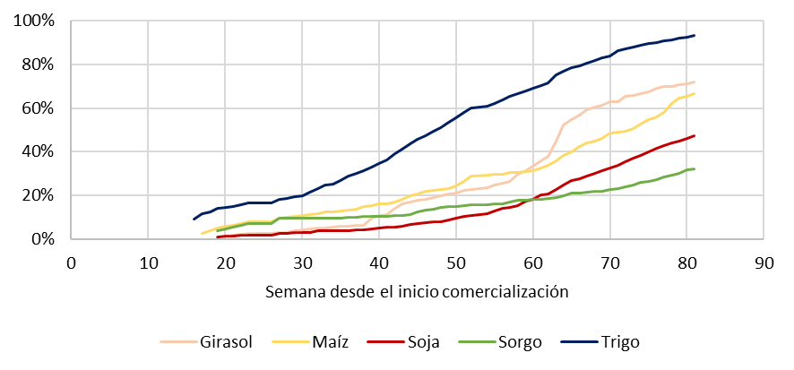 Mirando los números de la campaña 2021/22, surge que la comercialización en relación a la producción nacional estimada, se encuentra adelantada para trigo, maíz y girasol; mientras en soja está por debajo de los niveles registrados el año pasado y del promedio de las últimas campañas.