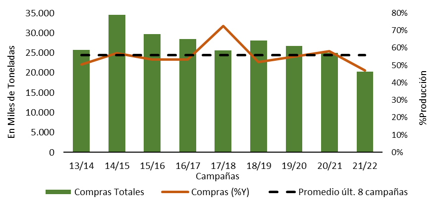 [4] En este sentido, lo que resta vender de soja para la campaña 2021/22 valuado a precio del productor equivale a 8.803 millones de dólares al tipo de cambio oficial ([Producción soja (43,3) - Compras totales (20,435)] * Ultimo precio disponible MATba (USD 385)).