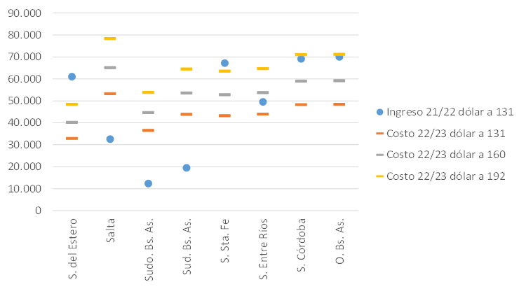 En segundo lugar, este incremento en la disparidad entre cotizaciones impulsa al alza a las expectativas de devaluación, lo que resulta especialmente crítico cuando se considera que la campaña 2022/23 ya se observa con precios de insumos históricamente elevados debido, en parte, a la guerra entre Rusia y Ucrania. De acuerdo a estimaciones propias, los costos para la próxima campaña registran aumentos de entre 40 y 50%. A la vez, la diferenciación en el tipo de cambio del producto y del insumo genera un agravamiento más profundo sobre los beneficios del productor, ya que el precio de los insumos está listado a partir del tipo de cambio oficial.