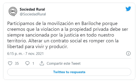 “Participamos de la movilización en Bariloche porque creemos que la violación a la propiedad privada debe ser siempre sancionada por la Justicia en todo nuestro territorio. Alterar un contrato social es romper con la libertad para vivir y producir. Así lo define nuestra Constitución y los derechos no se negocian”, indicó a LA NACION Carlos Odriozola, secretario de la SRA.