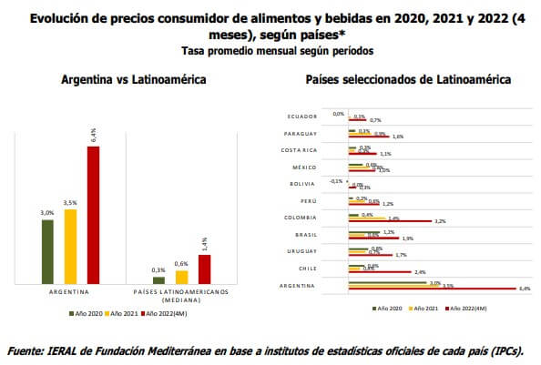 “Argentina no sólo no escapa de esta realidad, sino que la expone con crudeza, mostrando una gran aceleración de precios. En el caso de los alimentos y bebidas, la inflación local, que promediara el 3,5% mensual en el 2021, ha subido al 6,4% mensual en el primer cuatrimestre 2022”, explica el reporte de Garzón.