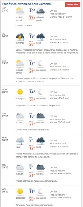 En este contexto, la Perspectiva Agroclimática Semanal que se extiende del 23 al 29 de octubre, el tiempo en Córdoba se caracterizaría por las siguientes condiciones: temperaturas elevadas primero, ambiente caluroso con precipitaciones de variada intensidad, principalmente durante la jornada de mañana viernes, algunas abundantes; y luego un marcado descenso térmico para los primeros días de la semana entrante.